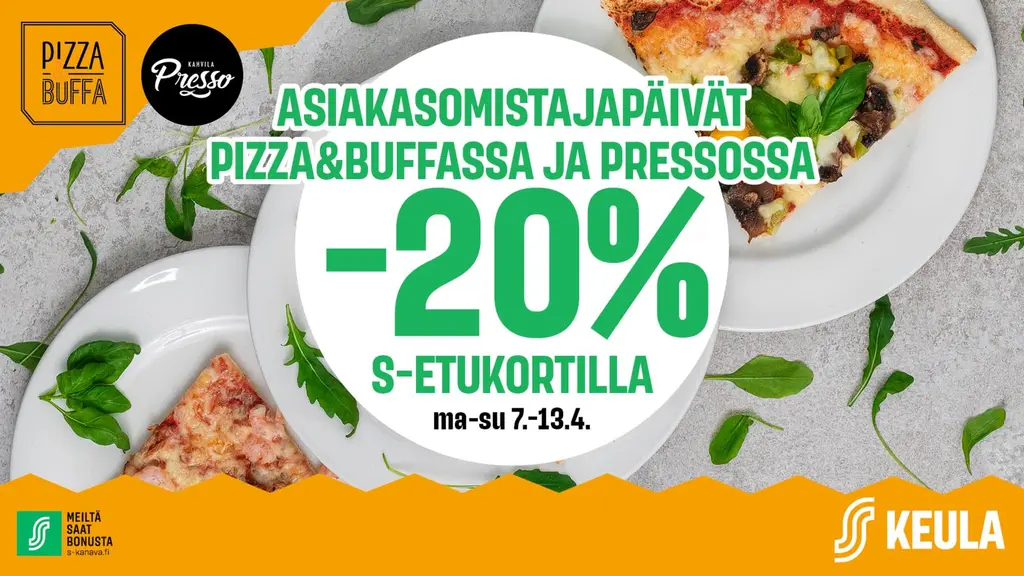 ASIAKASOMISTAJAPÄIVÄT PRISMAN RAVINTOLAMAAILMASSA MAANANTAISTA SUNNUNTAIHIN 7.-13.4.2025Asiakasomistaja herkuttelee edullisemmin Pizza&Buffassa ja Pressossa. Asiakasomistajapäivillä saat S-Etukortilla -20 % alennuksen normaalihintaisista tuotteista. Ei voi yhdistää muihin alennuksiin. Etu ei ole voimassa Ravintolamaailman Hesburgerissa.Siirry Pizza&Buffan sivuille>>Mikäli et ole vielä asiakasomistaja, niin liity heti >>
