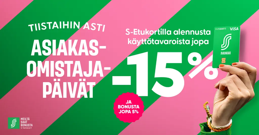 ASIAKASOMISTAJAPÄIVÄT RAUMAN PRISMASSA PERJANTAISTA TIISTAIHIN 15.-19.11.2024Rauman Prisman asiakasomistajapäiviltä hankit kaikkea jouluun ja tulevaan talveen. Saat käyttötavaraostoista jopa –15 % alennuksen S-Etukortilla! Asiakasomistajapäivät myös verkkokaupassa prisma.fiMikäli et ole vielä asiakasomistaja, niin liity heti >>