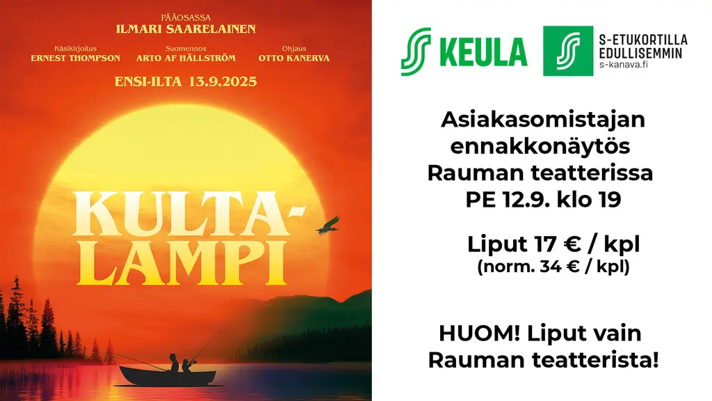 S-Etukortilla edullisemmin Rauman teatteriin. Asiakasomistajien ennakkonäytös kultalampi Rauman teatterissa pe 12.9. klo 19. Liput 17€ (norm. 34€) Huom! Liput vain Rauman teatterista!