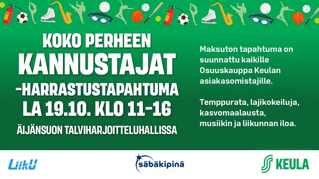 Kannustajat -seurat esittelevät toimintaansa, tarjoavat tekemisen iloa ja lajikokeiluja koko perheen maksuttomassa harrastustapahtumassa. Tapahtuma on suunnattu kaikille Osuuskauppa Keulan asiakasomistajille. Alle 10- vuotiaat liikkuvat vanhemman valvonnassa.Talviharjoitteluhallin kioski palvelee koko tapahtuman ajan ja tuotot ohjautuvat yhteistyökumppanillemme Pallo-Iiroille. Tapahtumassa liikuttajana myös LiikU ry.Temppurata, lajikokeiluja, kasvomaalausta, musiikin ja liikunnan iloa.Tapahtumassa mukana:Eurajoen Veikot