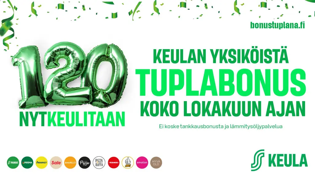 Koko kuukausi asiakasomistajan ja vihreän kortin juhlaa! Tuplabonus-kuukautena saat asiakasomistajana Keulan yksiköistä tekemistäsi ostoksista Bonusta tuplana. Se tarkoittaa sitä, että kampanja-aikana kampanjaan kuuluvista toimipaikoista tehdyistä ostoista maksettava Bonus kaksinkertaistuu. Ostot kirjautuvat sellaisenaan bonusostokertymään, mutta niistä kertyvä Bonus maksetaan tuplana.Bonus eli ostohyvitys on etu, jonka saat asiakasomistajana kaikista S-ryhmän ja yhteistyökumppaneiden bonustoimipaikoista. Bonusprosentin suuruuden määrää asiakasomistajatalouden kuluneen kuukauden aikana S-ryhmän tai sen yhteistyökumppaneilta tehtyjen bonusostojen yhteenlaskettu loppusumma. Jos kuukauden normaaliostot yltävät 3 %:n Bonukseen, Bonusta tuplana myöntävästä toimipaikasta kampanja-aikana tehdyistä ostoista saa silloin 6 %:n Bonuksen.Tuplabonusta ei myönnetä ABC asemien tankkauksista, eikä lämmitysöljypalvelun ostoista teknisten syiden takia.Lisätietoja bonustuplana.fi