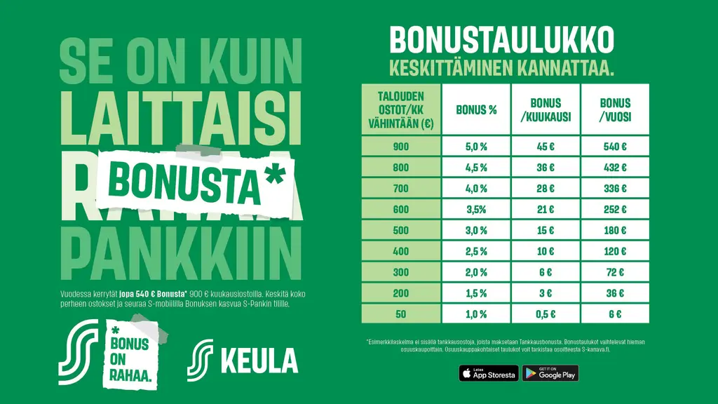 Koko kuukausi asiakasomistajan ja vihreän kortin juhlaa! Tuplabonus-kuukautena saat asiakasomistajana Keulan yksiköistä tekemistäsi ostoksista Bonusta tuplana. Se tarkoittaa sitä, että kampanja-aikana kampanjaan kuuluvista toimipaikoista tehdyistä ostoista maksettava Bonus kaksinkertaistuu. Ostot kirjautuvat sellaisenaan bonusostokertymään, mutta niistä kertyvä Bonus maksetaan tuplana.Bonus eli ostohyvitys on etu, jonka saat asiakasomistajana kaikista S-ryhmän ja yhteistyökumppaneiden bonustoimipaikoista. Bonusprosentin suuruuden määrää asiakasomistajatalouden kuluneen kuukauden aikana S-ryhmän tai sen yhteistyökumppaneilta tehtyjen bonusostojen yhteenlaskettu loppusumma. Jos kuukauden normaaliostot yltävät 3 %:n Bonukseen, Bonusta tuplana myöntävästä toimipaikasta kampanja-aikana tehdyistä ostoista saa silloin 6 %:n Bonuksen.Tuplabonusta ei myönnetä ABC asemien tankkauksista, eikä lämmitysöljypalvelun ostoista teknisten syiden takia.Lisätietoja bonustuplana.fi
