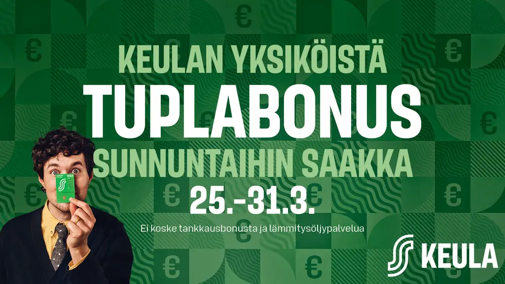 Koko viikko asiakasomistajan ja vihreän kortin juhlaa! Tuplabonus-viikolla saat asiakasomistajana Keulan yksiköistä tekemistäsi ostoksista Bonusta tuplana. Se tarkoittaa sitä, että kampanja-aikana kampanjaan kuuluvista toimipaikoista tehdyistä ostoista maksettava Bonus kaksinkertaistuu. Ostot kirjautuvat sellaisenaan bonusostokertymään, mutta niistä kertyvä Bonus maksetaan tuplana.Bonus eli ostohyvitys on etu, jonka saat asiakasomistajana kaikista S-ryhmän ja yhteistyökumppaneiden bonustoimipaikoista. Bonusprosentin suuruuden määrää asiakasomistajatalouden kuluneen kuukauden aikana S-ryhmän tai sen yhteistyökumppaneilta tehtyjen bonusostojen yhteenlaskettu loppusumma. Jos kuukauden normaaliostot yltävät 3 %:n Bonukseen, Bonusta tuplana myöntävästä toimipaikasta kampanja-aikana tehdyistä ostoista saa silloin 6 %:n Bonuksen. Parhaimmillaan saat TuplaBonusta jopa 10 %!Tuplabonusta ei myönnetä ABC asemien tankkauksista, eikä lämmitysöljypalvelun ostoista teknisten syiden takia.Lisätietoja bonustuplana.fi