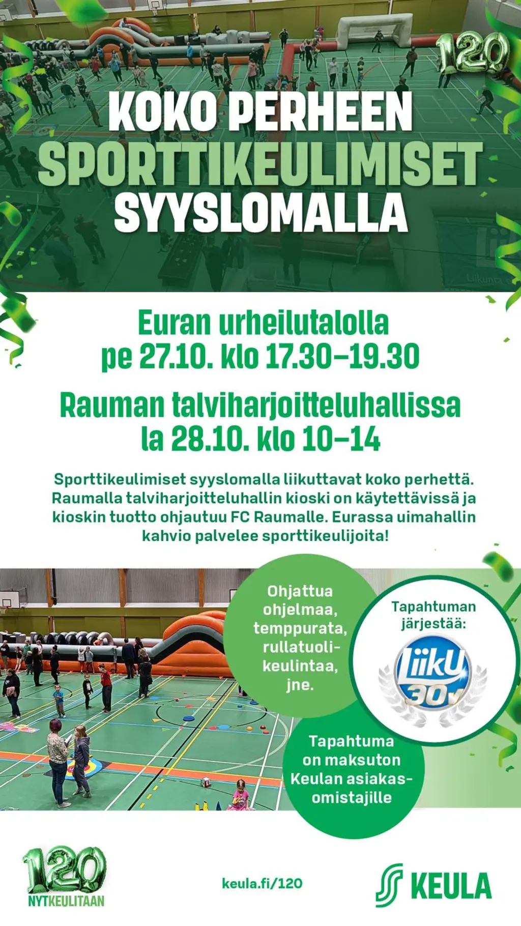 Sporttikeulimiset syyslomalla liikuttavat koko perhettä. Tapahtumissa ohjattua ohjelmaa, temppurata, rullatuolikeulintaa jne. Tapahtuma on maksuton Keulan asiakasomistajille. Tapahtuman järjestää LiikU