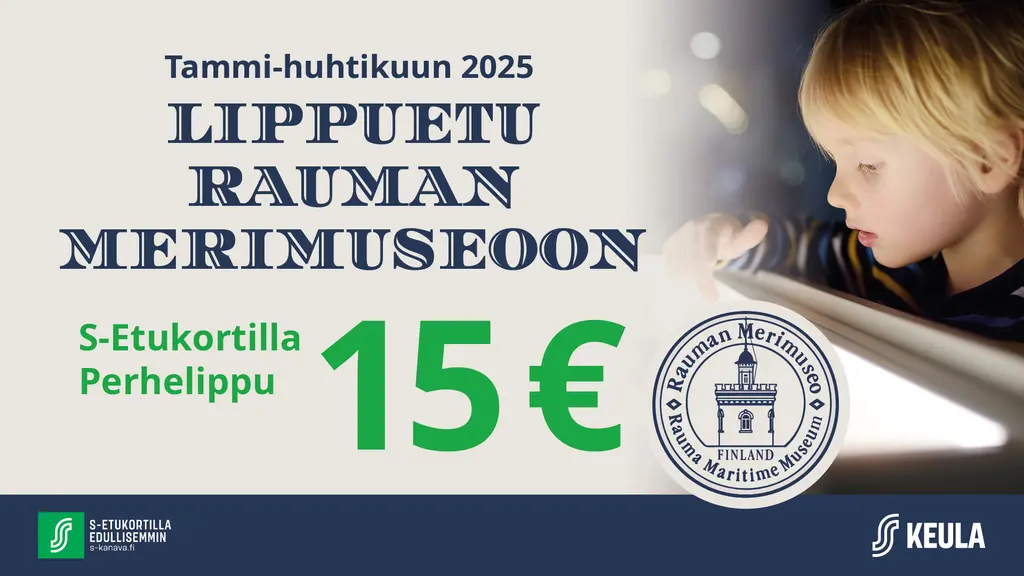 Hyödynnä alkuvuoden Osuuskauppa Keulan lippuetu Rauman merimuseoon. Tule tutustumaan merenkulun tarinoihin ja ajelemaan laivasimulaattorilla.Liput S-Etukortilla edullisemmin:- Perhelippu 15 € (norm. 23 €) 2 aikuista ja 2-3 lasta