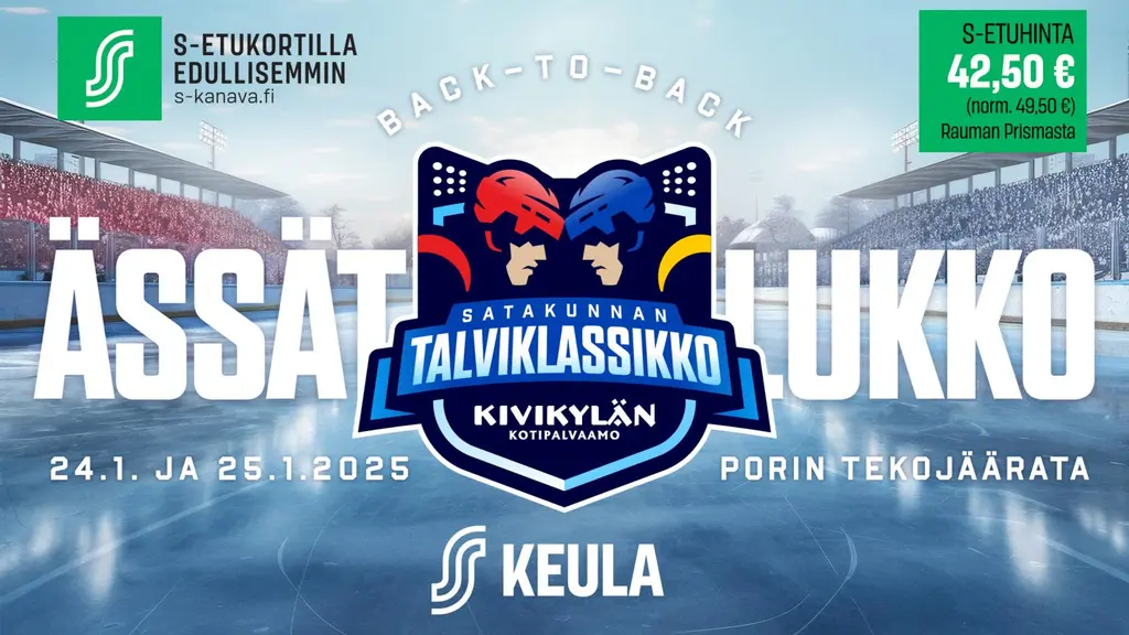 S-Etuhintaiset liput Lukko-Ässät Talviklassikkoon 24.1. ja 25.1.2025Liput myyntiin tänään tiistaina 2.4. klo 12Osuuskauppa Keulan asiakasomistajat saavat ennakko-ostoedun molempiin Talviklassikon Lukko-Ässät -otteluihin Porissa tammikuussa 2025. Lipunmyynti alkaa virallisesti vasta 19.4., mutta Keulan asiakasomistajat voivat ostaa lippuja ti 2.4. klo 12 alkaen.S-Etuhintaiset liput ovat ostettavissa Rauman Prismasta tai Ticketmasterin verkkokaupasta. Lippuja on myynnissä rajoitettu erä, liput myydään molempiin otteluihin erikseen. Ostorajoitus on kaksi lippua/Osuuskauppa Keulan asiakasomistaja.