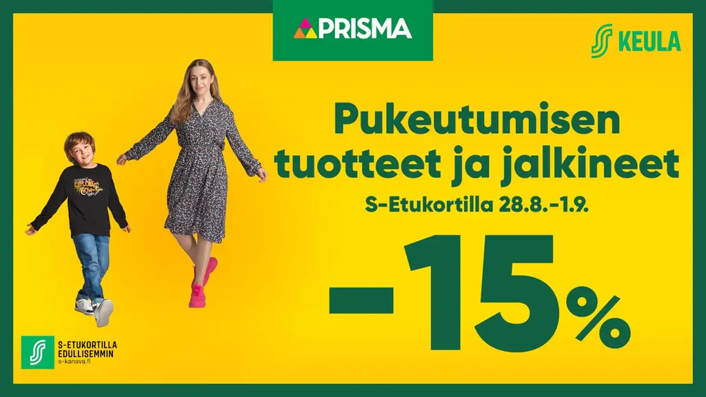 Prismasta pukeutumisen tuotteet ja jalkineet -15 % 28.8.-1.9.
