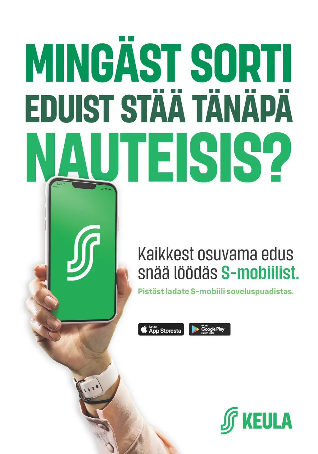 Lataamme S-mobiiliin rahanarvoisia etuja joka kuukausi. Edut ovat voimassa kuun ensimmäisestä päivästä viimeiseen päivään. S-mobiiliedut lunastetaan yksikön palvelukassalla (ei lunastettavissa itsepalvelukassoilla) henkilökohtaisesti. S-mobiilin omiin suosikkeihin voi tallettaa suosikkiedut kirjanmerkki-ikonilla kassa-asioinnin nopeuttamiseksi.S-mobiilin kuukausiedut ovat yksiköidemme tavanomaisia hintaetuja suurempia, joten ne tulee lunastaa kertakäyttöisellä etukupongilla siinä yksikössä, jonne etu on S-mobiilissa merkitty.S-mobiilin edut saa käyttöön lataamalla apin älypuhelimen sovelluskaupasta. Tarvitset käyttöönottoon verkkopankkitunnukset. S-mobiili on asiakasomistajille ja talouden muille perheenjäsenille maksuton. Keulaedut ovat kaikkien S-mobiilikäyttäjien lunastettavissa. Lisätietoja S-mobiilista >>Mikäli tarvitset apua S-mobiilin kanssa, autamme sinua mielellämme Keulan asiakaspalvelussa puh. 02 833 0220 tai Asiakasomistajapalvelu ja S-Pankki -pisteillämme Eurassa, Laitilassa tai Raumalla. Prismakeskuksen palvelupisteen vuoroasiointi on avoinna ma-pe 9-17 sekä la 10-16. Kaikkien yksiköiden ajanvaraus: s-pankki.fi/ajanvaraus>>