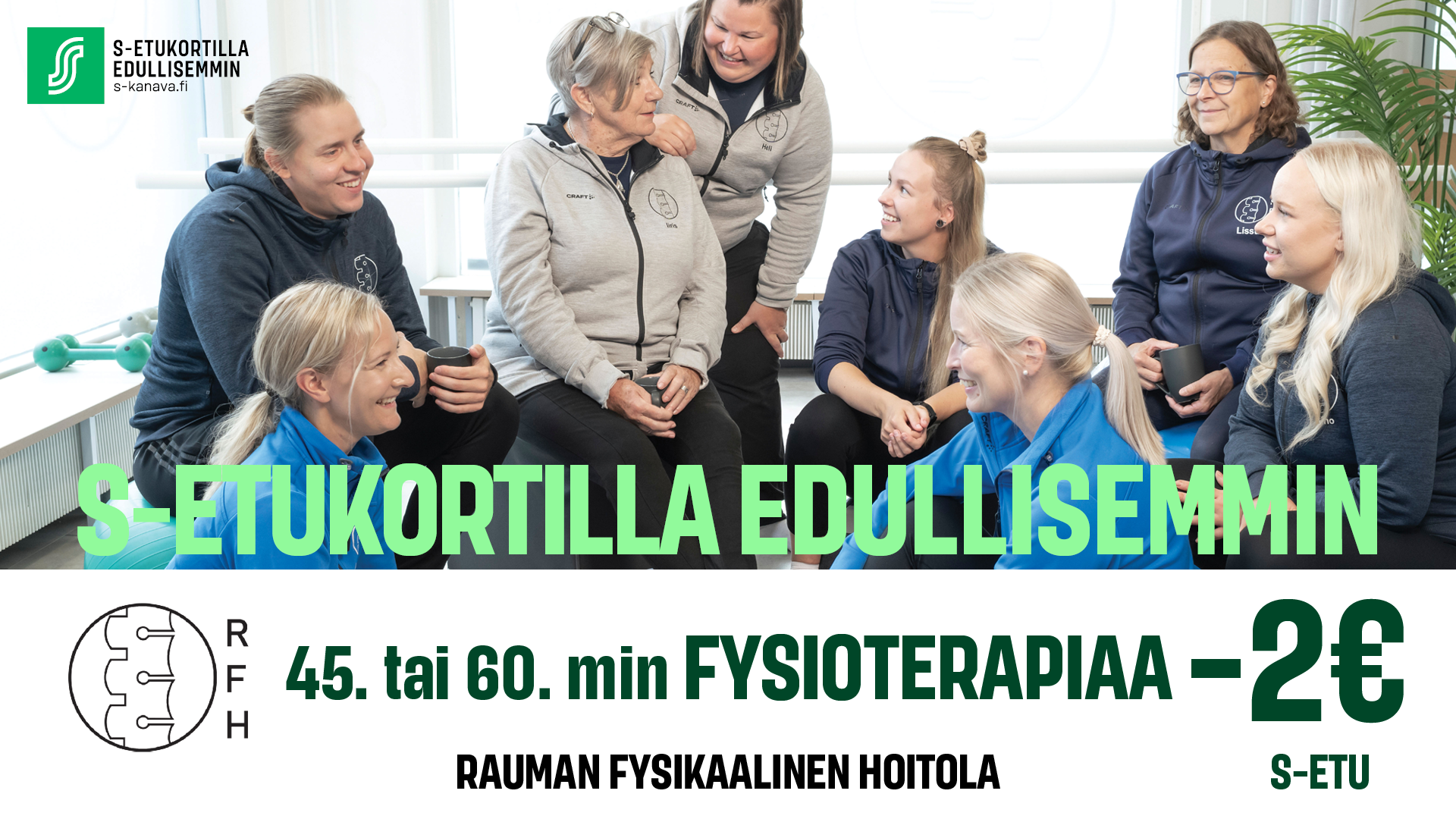 S-Etukortilla edullisemmin fysioterapiaan. Saat S-Etukortilla 45. tai 60. min fysioterapiaa -2€.