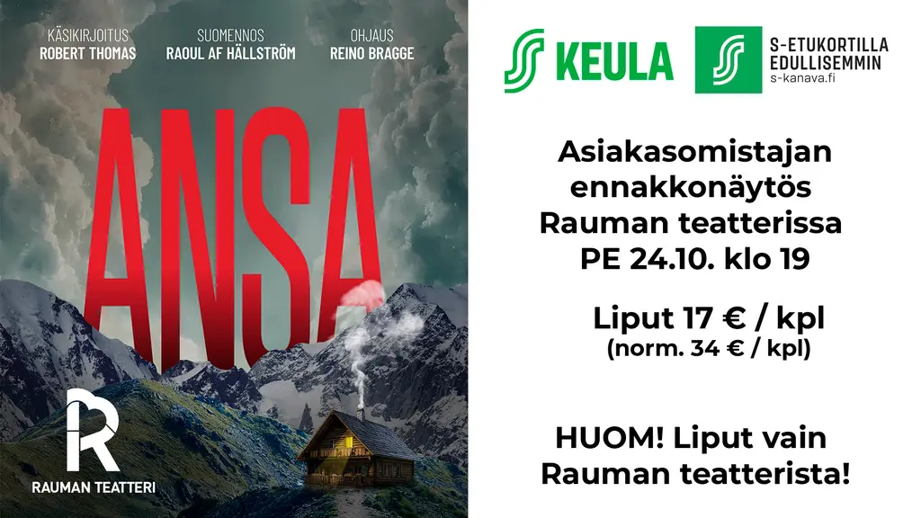 Muut Edut14.10.2025UUTINENRobokuljetukset veloituksetta 26.10. saakkaAsiakasomistajuusEdut10.10.2025UUTINENDigineuvontakiertue Keulan toimipaikoissa 15.-24.10.AsiakasomistajuusEdut10.10.2025UUTINENSuper Tilipäivän edut 10.10.AsiakasomistajuusEdut6.10.2025UUTINENAnsa – Asiakasomistajan ennakkonäytös Rauman teatterissa 24.10.AsiakasomistajuusEdut2.10.2025UUTINENAlbatrossi ja Heiskanen S-Etunäytös 15.10. BrummissaAsiakasomistajuusEdut30.9.2025UUTINENKeulan yksiköistä TuplaBonus koko lokakuun ajanAsiakasomistajuusEdutSiirry edelliselle sivulleEdellinen1Siirry sivulle 12Siirry sivulle 23Siirry sivulle 34Siirry sivulle 45Siirry sivulle 5…16Siirry sivulle 16Siirry seuraavalle sivulleSeuraava